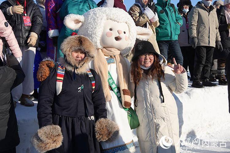 游客和冰雪那达慕吉祥物“呼伦小羊”合影。人民网记者 赵梦月摄
