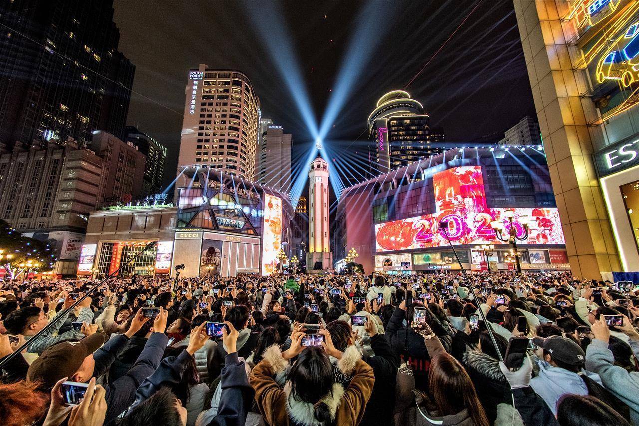 1月1日0时,重庆市渝中区解放碑准时敲响新年钟声,市民游客组成的人潮高喊“新年快乐”,庆祝旧岁辞去,新岁启封。