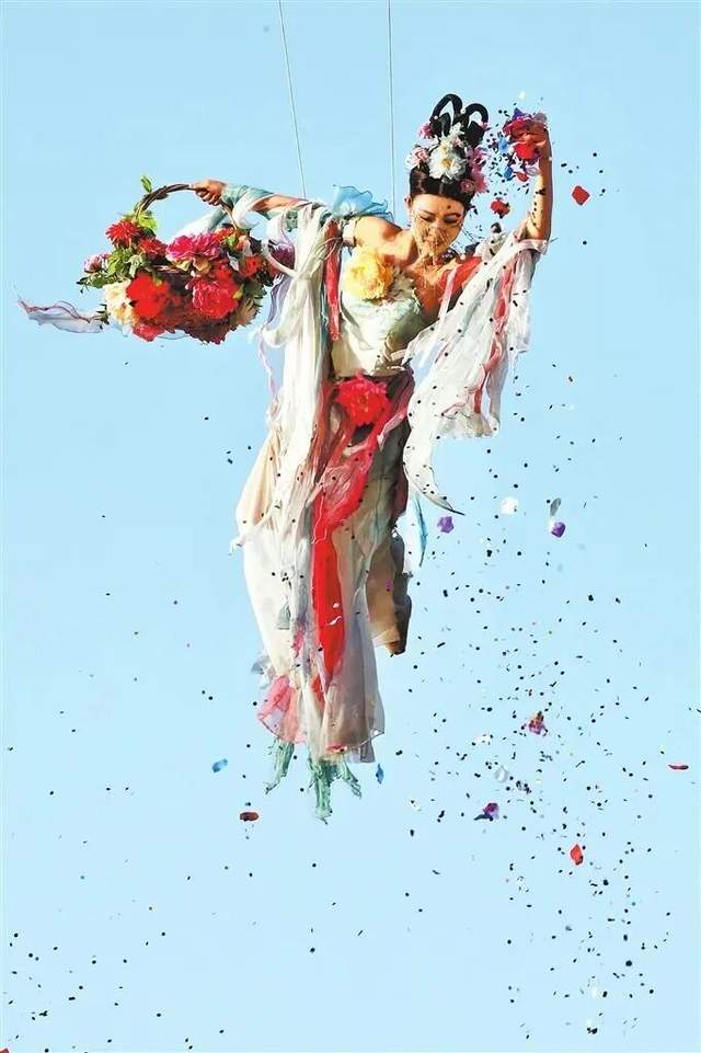 演员在洛阳市洛邑古城景区表演天女散花。 记者 王铮 摄